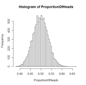 - 10,000 次抛掷硬币实验中出现正面的平均比率,每次抽樣(实验)的樣本數為 200(抛掷 200 次硬币)