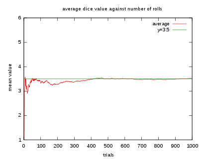 - 以特定掷单个骰子的过程来展示大数定律。随着投掷次数的增加,所有结果的均值趋于 3.5(骰子点数的期望值)。不同时候做的这个实验会在投掷次数较小的时候(左部)会表现出不同的形状,当次数变得很大(右部)的时候,它们将会非常相似