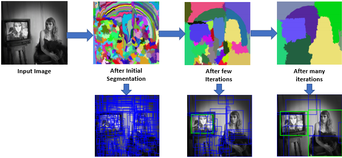 - 查看现有小区域,按照合并规则合并可能性最高的相邻两个区域。重复直到整张图像合并成一个区域位置