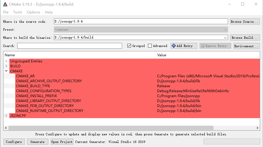 - 生成完成后,第二步截图上的 CMAKE_INSTALL_PREFIX 指定的路径将安装 jsoncpp,确认该路径是否生成