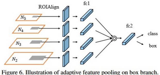 - 自适应特征池化将单层特征换成多层特征,即每个 ROI 需要和多层特征 (N2~N5) ROIAlign 的操作,然后将得到的不同层的 ROI 特征融合在一起,这样每个 ROI 特征就融合了多层特征