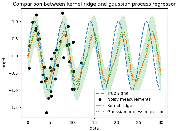 - 两种方法都学习了目标函数的合理模型。GPR 正确地识别了函数的周期性,大约是 2∗π(6.28),而 KRR 选择了加倍的周期性 4∗π。除此之外,GPR 还提供了合理的预测置信度界限,这是 KRR 所没有的。这两种方法的一个主要区别是拟合和预测所需的时间:虽然 KRR 的拟合原则上很快,但超参数优化的网格搜索会随着超参数数量的增加而呈指数增长(“维度诅咒”)。GPR 中基于梯度的参数优化不会受到这种指数扩展的影响,因此在这个具有 3 维超参数空间的例子中速度要快得多
