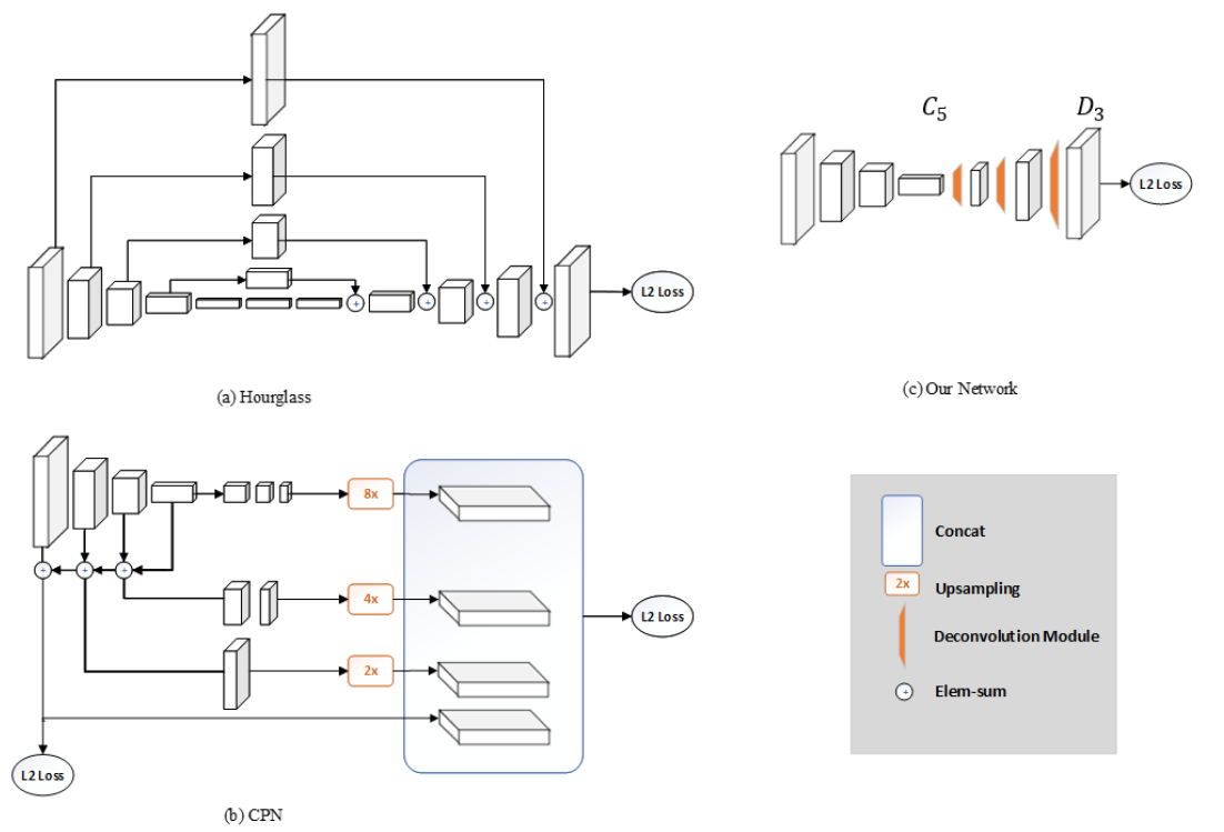 - 对比之前的 hourglass 和 CPN 的结构都会显得十分简单,只是简单地在 resNet 的最后一个卷积 stage 后面加了一些 deconvolutional layers。这些 deconvolutional layers 默认跟着一个 BN 和 ReLU。每一层都有 256 * 4 * 4 的卷积核,stride 为 2。最后通过一个 1∗1 的卷积核计算得到 heatmaps