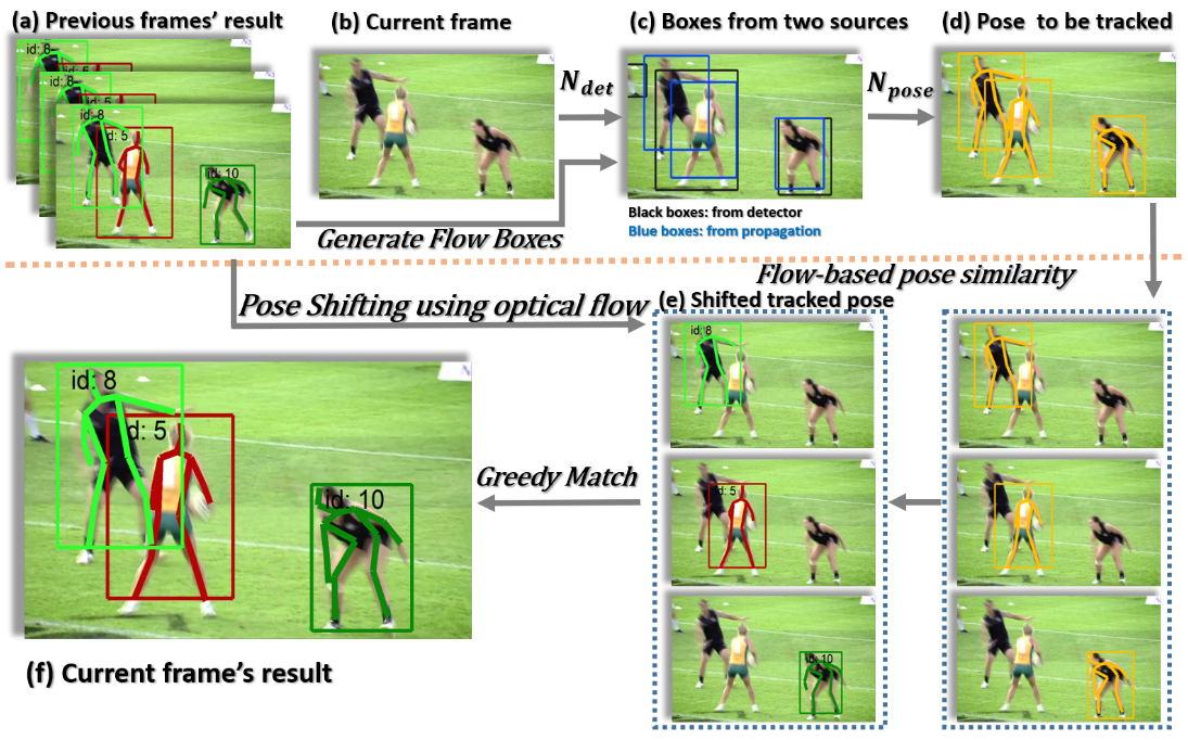 - 改进:1)除了检测网络之外,还使用光流法补充一些检测框,用以解决检测网络的漏检问题;2)使用 Object Keypoint Similarity (OKS) 代替检测框的 IOU 来计算相似度。这是因为当人的动作比较快时,用 IOU 可能并不合理