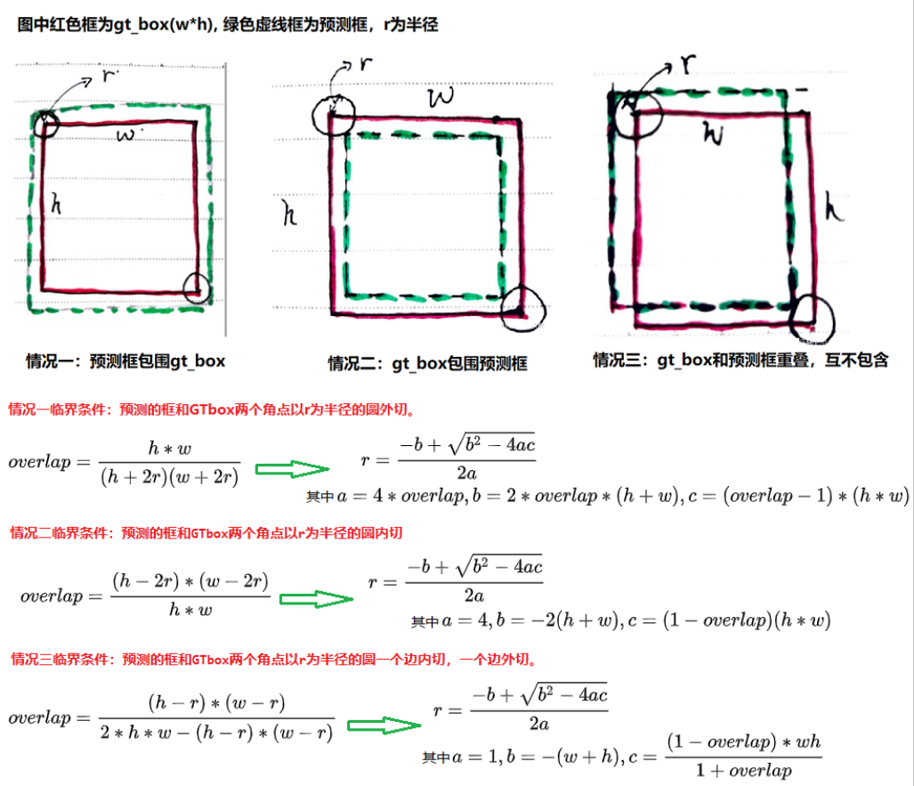 - 关于高斯圆半径确定,主要还是依赖于目标 box 的宽高,实际情况下通常会取 IOU=0.7,即下图中的 overlap=0.7 作为临界值,然后分别计算出三种情况的半径,取最小值作为高斯核的半径 R