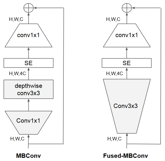 - Fused-MBConv:用单个常规组件 3x3 取代了 MBConv 中的分段 conv 3x3 和扩展 conv 1x1
