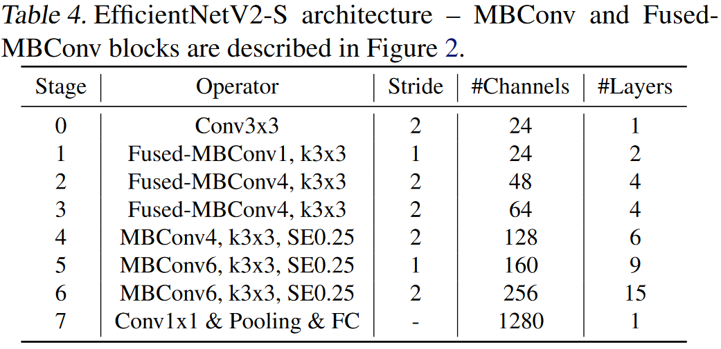 - EfficientNetV2-S 架构,包含 MBConv 和 FusedMBConv