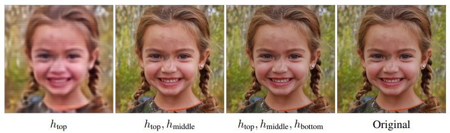 - VQ-VAE-2 将顶层全局与底层局部信息分离开来,生成全局自洽,局部高清的图像