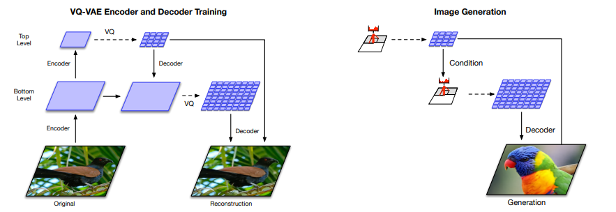 - VQ-VAE-2 是两层的 VQ-VAE,其中上层潜在空间 32 x 32, 下层潜在空间大小 64 x 64。上层首先进行分层量子化,得到量子化后的字典向量