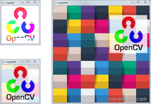 imgAddW3 = cv2.addWeighted(img1, 0.8, img2, 0.2, 0) # 加权相加, a=0.8, b=0.2