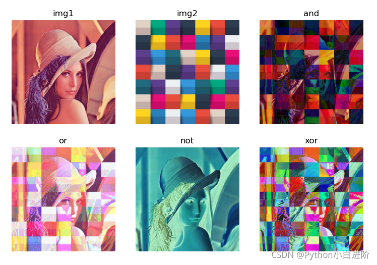 imgXor = cv2.bitwise_xor(img1, img2) # 按位 异或(XOR)