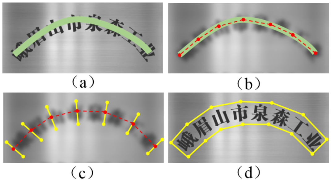 - b) 对文本中心线采样,采样点的间距相同,则得到的采样点数目与文本线的长度有关,故称之为自适应采样