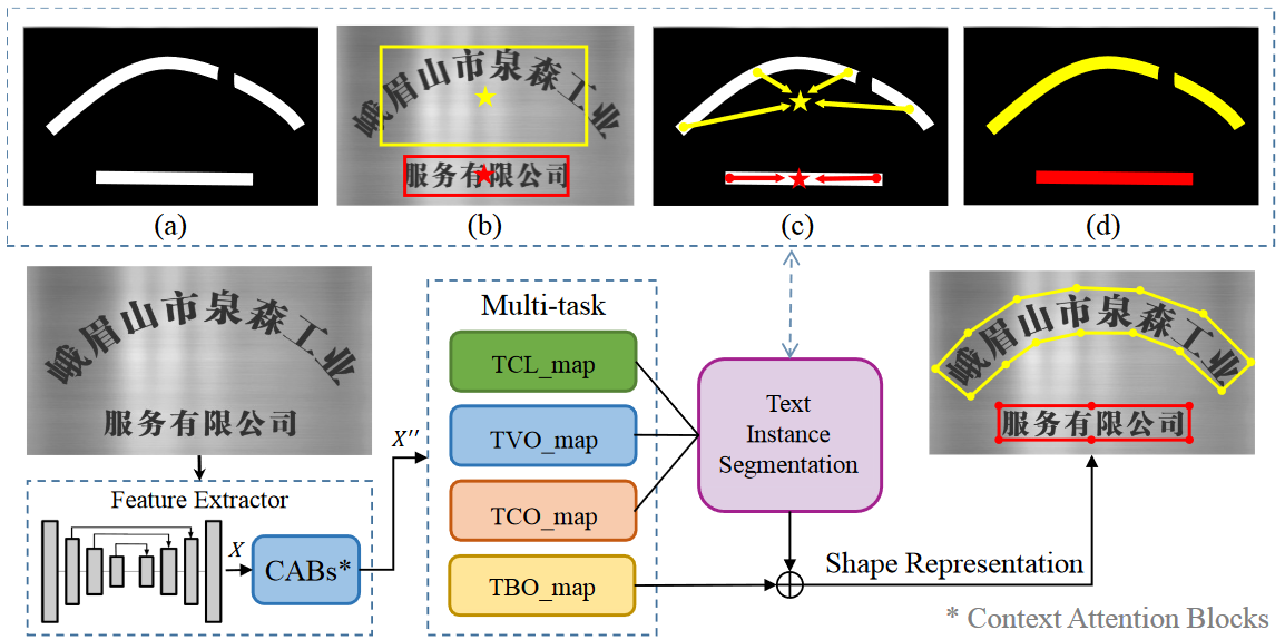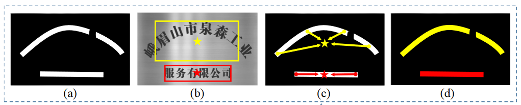 - b+c=d) 根据 TCO 合并文本实例 -> 文本行 Mask :计算 TCL 中属于文本的像素点的所属文本实例的几何中心点,该中心点将作为低层级像素信息,当步骤 c 计算所得的几何中心点与步骤 b 所得矩形框中心点重合或相近时,该像素点将被归类给步骤 b 中矩形框对应的文本实例,通过此步骤重新合并断开的文本行