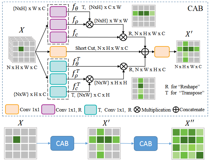 - 交叉注意力模块,用于整合 BackBone 的特征,该模块分为上下两部分,上部分构建水平方向注意力,下部分构建垂直方向注意力,整合水平方向注意力和垂直方向注意力得到全局注意力