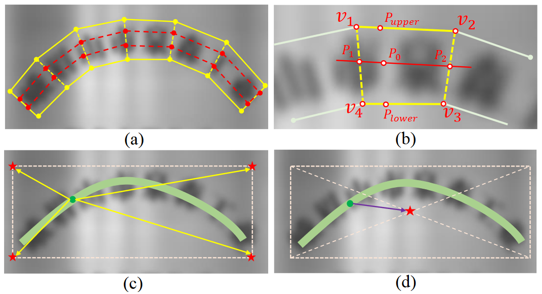- b). TBO map (4 xHxW):文本边界偏置,首先计算斜率 k 1 (v 1, v 2) 与斜率 k 1 (v 4, v 3) 的平均值,对于一个给定的点 P 0,可容易地计算出斜率为 (k 1+k 2)/2、过点 P 0 的直线,由此该直线与线段 (v 1, v 4) 和线段 (v 2, v 3) 的交点 P 1 与 P 2 很容易得出,故 P 0 的上下边界点 和 的坐标可由线段比例关系得到,整理得到 P 0 点到四边距离的 TBO 为 {, ,,}