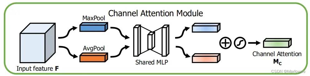 - 最后,将 MLP 输出的特征进行基于 element-wise 的加和操作,再经过 sigmoid 激活操作,生成最终的通道加权,即 M_c