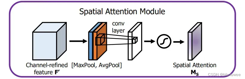 - 最后,经过 sigmoid 学习空间元素之间的依赖关系,生成空间维度的权重,即 M_s