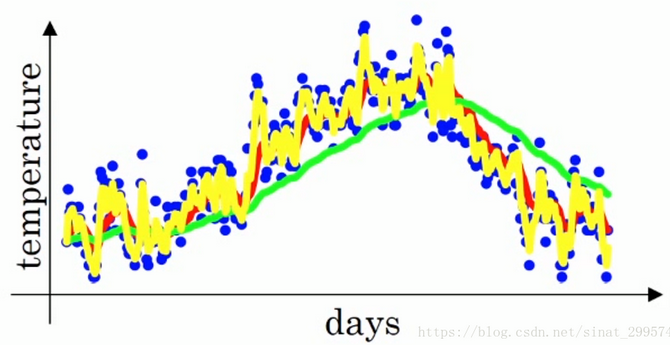 - 通过温度的局部平均值 (移动平均值) 来描述温度的变化趋势,通过下面的公式来计算平均值, 表示当天的温度, 表示局部平均值