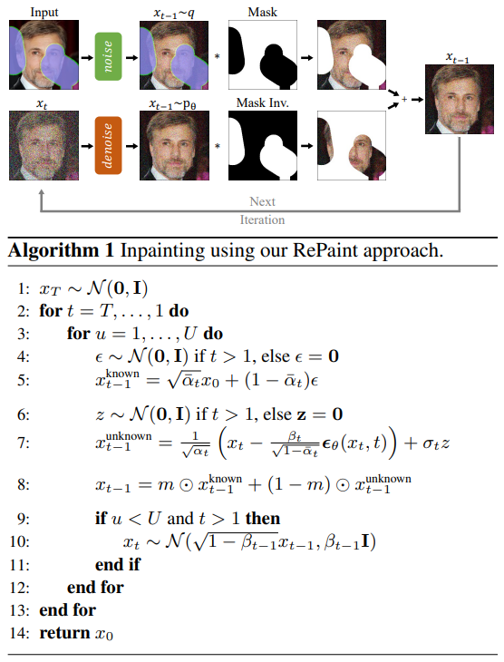 - 利用 DDPM 模型做图像修复 (Inpainting) 的算法,其原理是利用已知部分预测未知部分,核心操作是基于已知部分加躁,然后在 时拆分为估计已知部分和未知部分,通过线性组合这部分完成图像修复