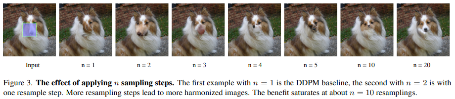 - 发现,如果单纯执行上述步骤,恢复的结果还是不太和谐,因此又提出了 ** 重采样(Resampling)** 的操作。具体而言,对于每一步 t ,利用上图算法生成 后,再对其进行加噪得到 ,进而再执行一次图 1 算法再次得到 ,这样的操作称为重采样