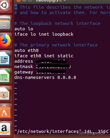 - 按照下图修改 /etc/network/interfaces ,也可将 dns 修改到 /etc/resolv.conf ,但是 linux 下次重启后失效
