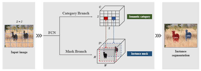 - SOLO 核心思想是将实例分割问题转化为两个同时存在的类别感知预测和实例感知掩码生成问题。具体来说,我们的系统将输入图像分成一个统一的网格,即 S×S,如果一个对象的中心落在一个网格单元中,该网格单元负责 1)预测语义类别,2)分割该对象实例