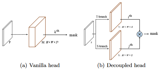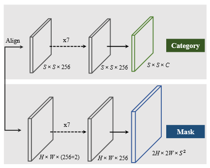 - 为了解决这个问题,提出了解藕的 Mask 预测分支,它有两个 HxWxS 的 featrue map 组成,分别表示 X、Y 两个方向的向量,如果第 i 个 grid 有实例,直接拿出 X 、Y 的 相乘,即是其 Mask 预测结果