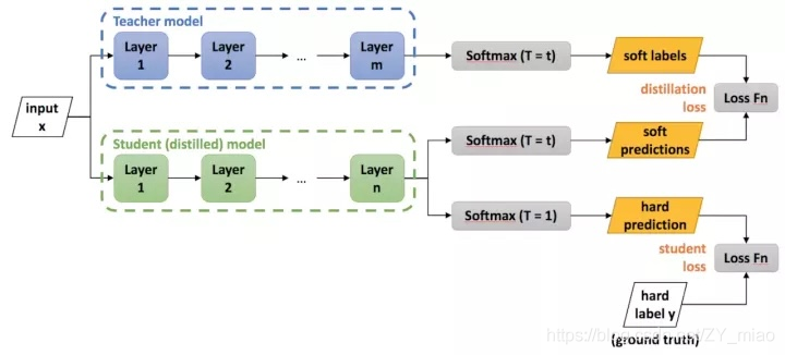 - 蒸馏时,使用软目标和硬目标联合训练 student 模型。当软目标具有高熵值,在训练每一个样本时软目标能够提供比硬目标(student) 模型的 (ground truth)更多的信息并且训练每一个样本时的梯度差异更小。因此,与 teacher 模型相比,student 模型训练数据要少得多,使用的学习率也高得多