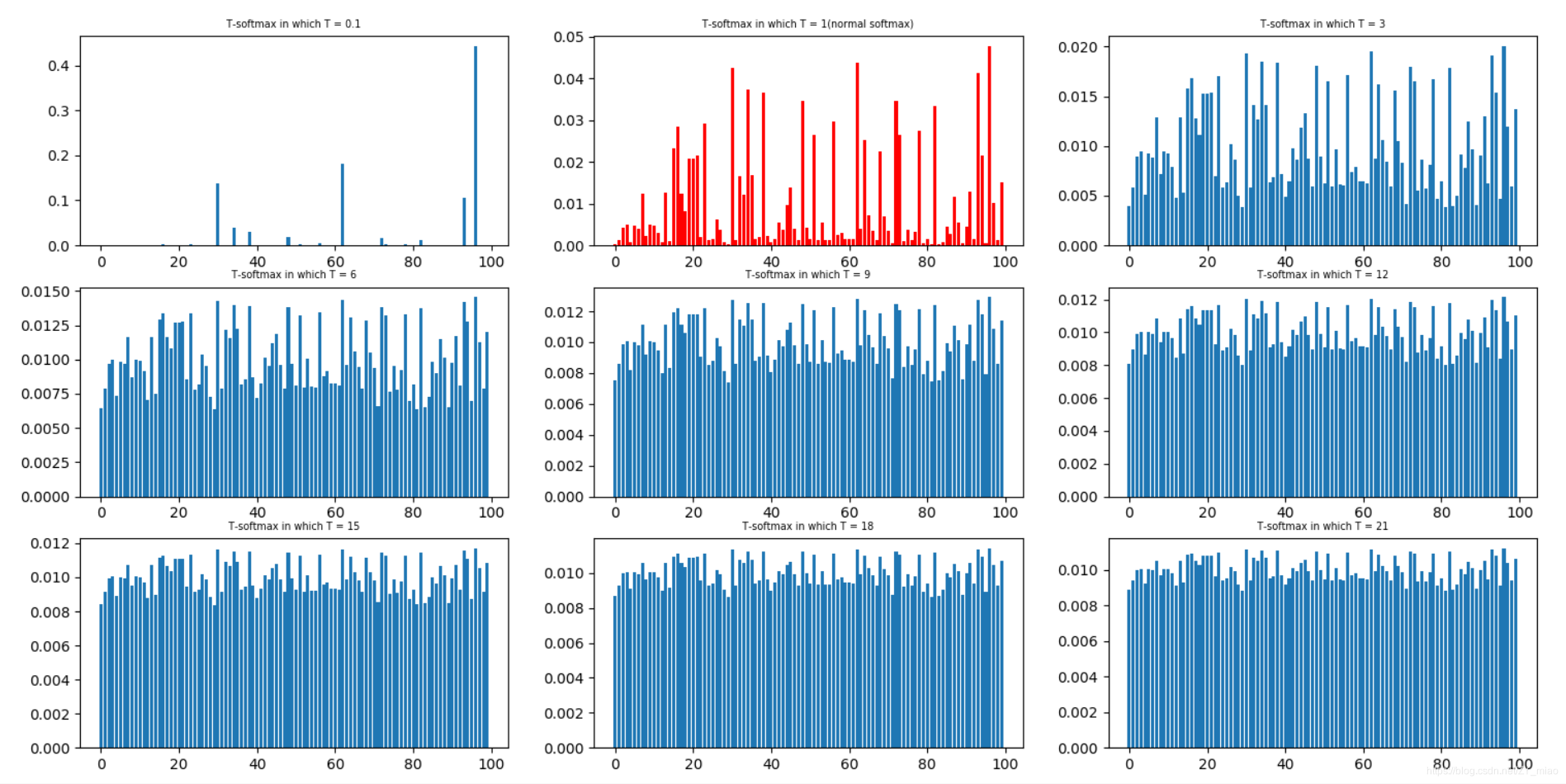- 论文先将 teacher 模型的输出 z 除于温度 T,再变换后的值求 softmax,不同的 T 可以产生不同强度的差异,如图红色是 T=9 的时候各个类别的概