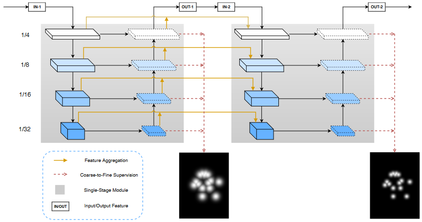 - 每个 stage 的输出都能作为最终的关键点检测结果。而且随着 stage 的增多,关键点定位会越来越准。为了使得在前端的 stage 能够获得更好的知道,作者提出了由粗到细的多分支监督的方式来优化多 stage 的能力