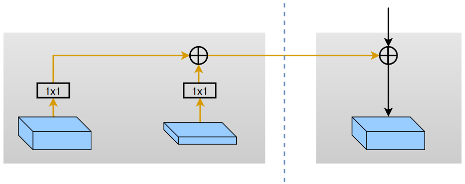 - 同分辨率的特征使用 1 x 1 卷积调整通道数,得到的通道数和下采样特征通道数一样