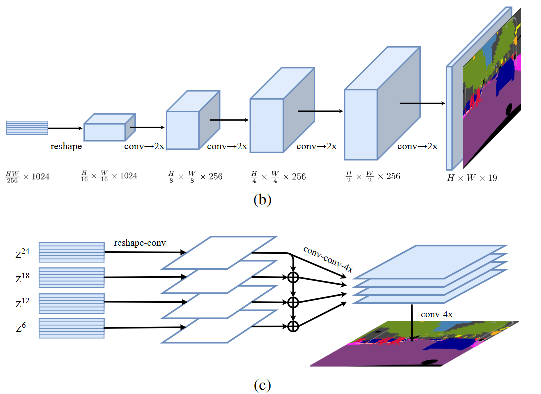 - Encoder 输出 (B, H/16, W/16, C) 数据, SETR 设计了三种解码器上采样方法还原分辨率,实验证明 PUP 效果更好,最终采样该方法