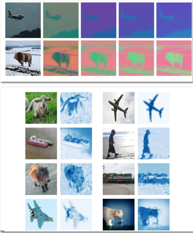 - 第一张图:可视化 Encoder 的某些 tansformer block 的输出,可以看出在低层的 tansformer block 已经构建全局注意力关系