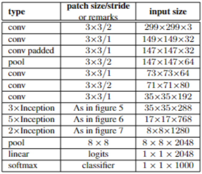 - GoogleNetv2 基础上改进,主要是引分解卷积实现计算量的下降
