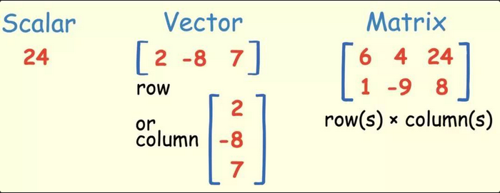 - 向量 (vector) 将标量 (scalar) 从零阶推广到一阶,矩阵将向量从一阶推广到二阶