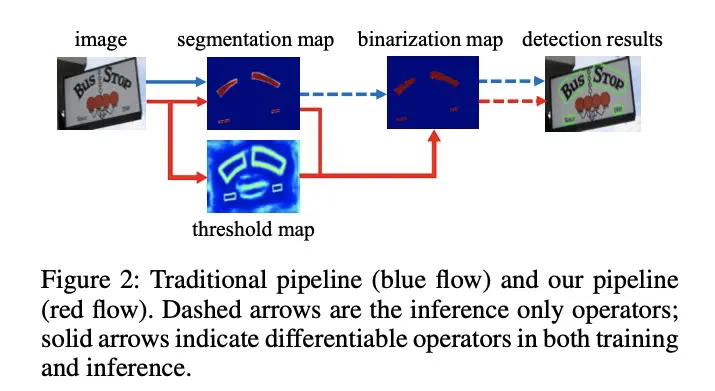 - 传统意义二值化:基于分割的文本检测算法其流程如图 2 中的蓝色箭头所示。在传统方法中得到分割结果之后采用一个固定阈值得到二值化的分割图